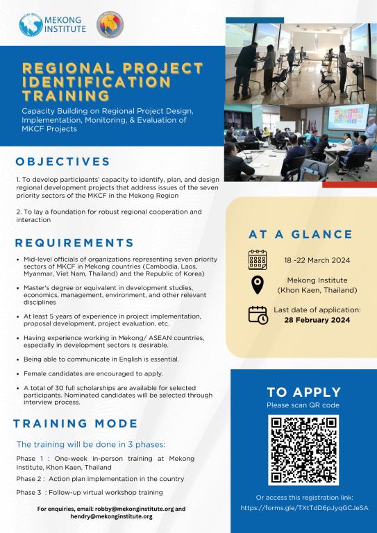 Mekong Institute (MI) is organizing a Regional Project Identification Training with the support of the Mekong-Korea Cooperation Fund (MKCF). The training aims to enhance participants’ ability to strategize and formulate regional development initiatives targeting the seven priority sectors outlined by MKCF. Interested applicants should apply by February 28, 2024.